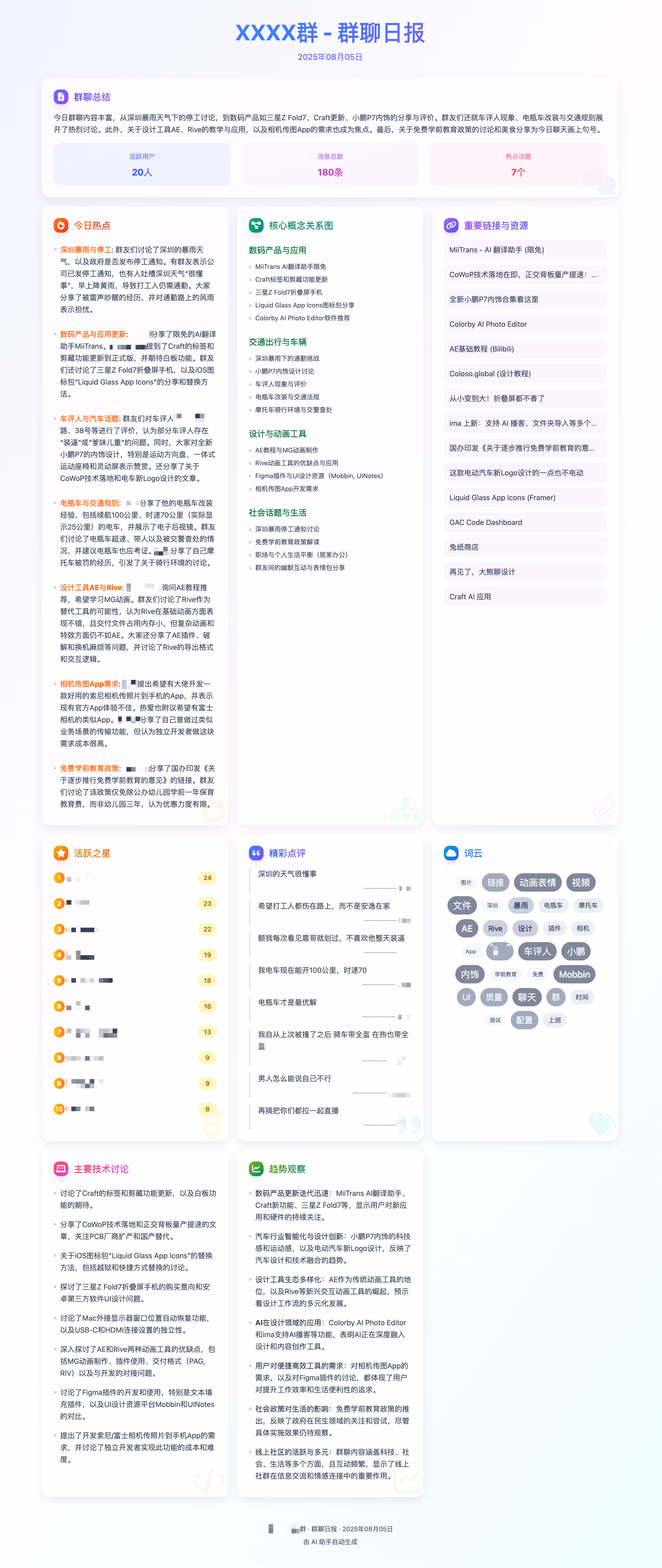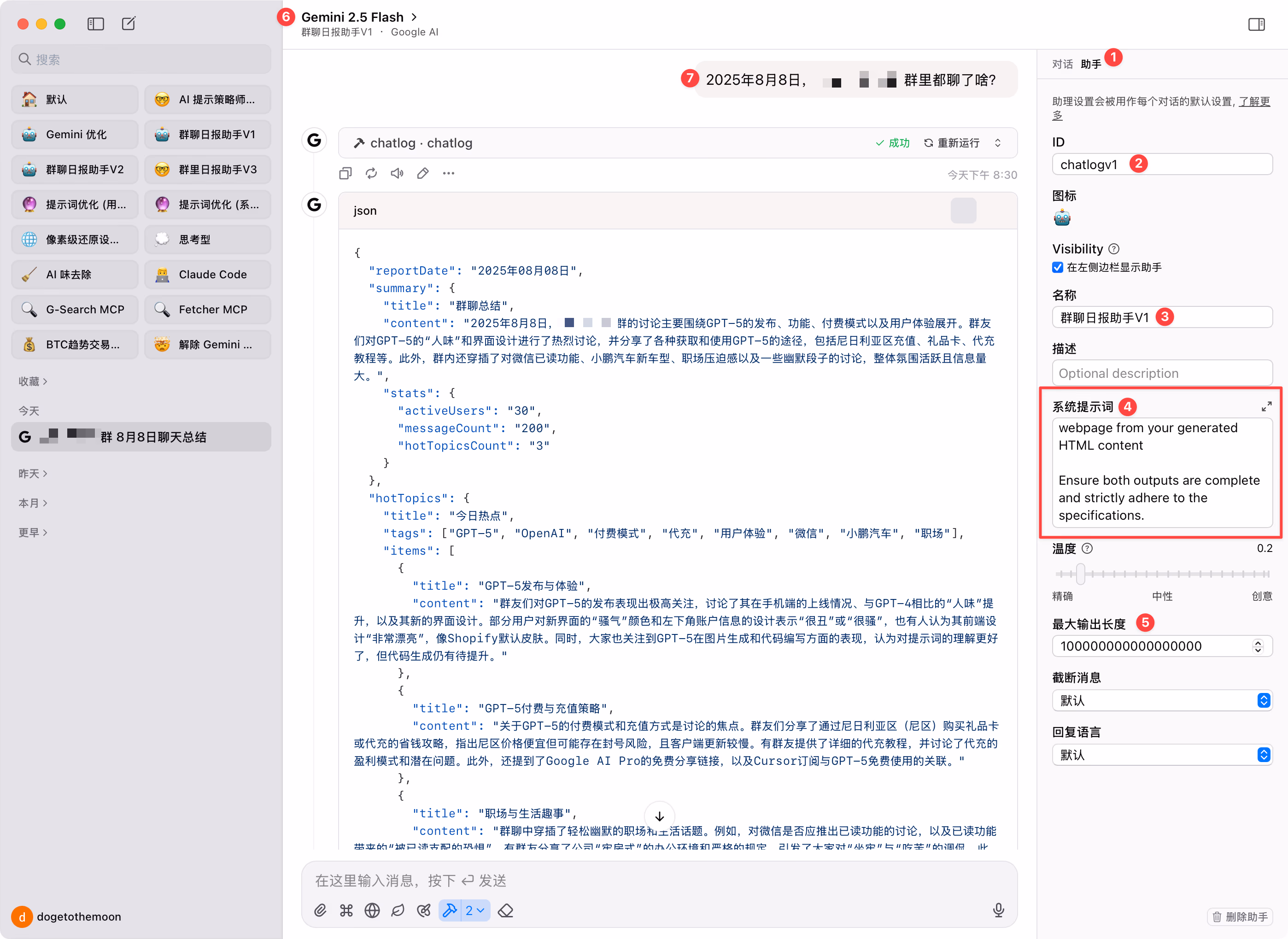 一个微信群聊日报总结助手 Workflow,可以用 AI 自动总结微信群聊对话,并生成日报 HTML 网页报告。其实一定时间范围内的聊天记录,都可以总结,时间跨度越大越消耗 Token。